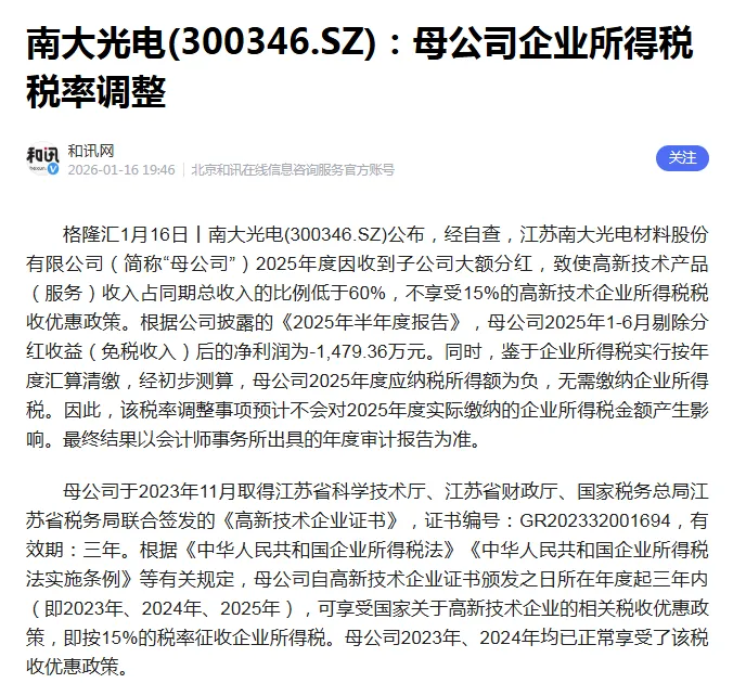 1、经自查,江苏南大光电材料股份有限公司(以下简称“母公司”)2025年度因收到子公司大额分红,致使高新技术产品(服务)收入占同期总收入的比例低于60%,不享受15%的高新技术企业所得税税收优惠政策。