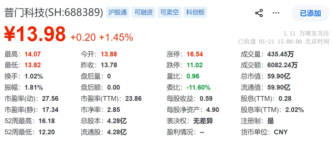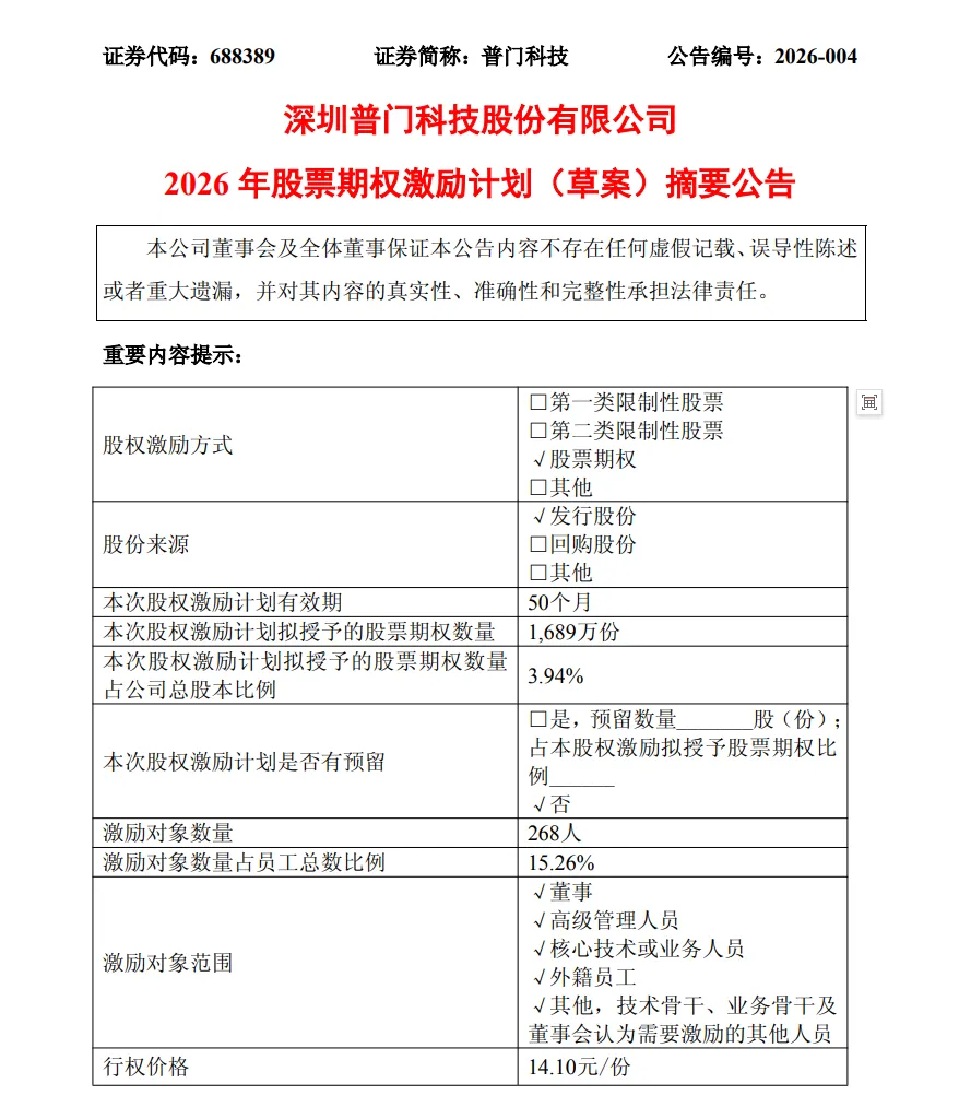 1月20日,普门科技发布了《2026年股票期权激励计划》,拟向268名激励对象授予总计1689万份股票期权,占公司总股本的3.94%,行权价格为14.10元/份,预计股份支付总费用达1740.62万元,1689万份股票期权股份价值为2.38亿元。