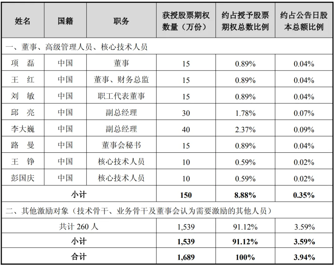 董事、高级管理人员及核心技术人员:如董事项磊、财务总监王红等,共获授约150万份期权;