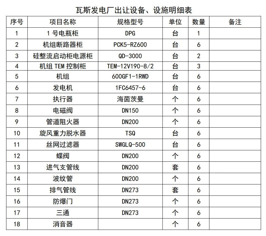 项目名称:6×600kW低浓度瓦斯发电机组及配套设备出让项目
