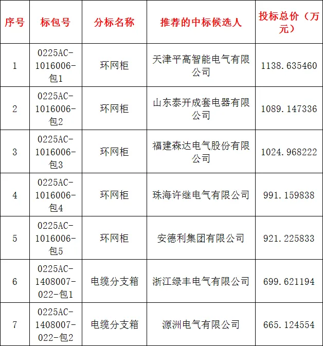 国网北京市电力公司2025年第三次配网物资协议库存公开招标采购项目评标工作已经结束,依据《中华人民共和国招标投标法实施条例》、《招标公告和公示信息发布管理办法》对中标候选人公示的规定,现将评标委员会推荐的中标候选人予以公示,公示期 3 日。投标人或者其他利害关系人若对评标结果有异议的,请在中标候选人公示期间以书面形式(扫描件)提出。