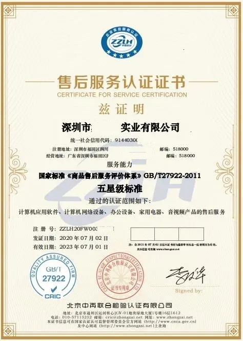 商品售后服务体系证书