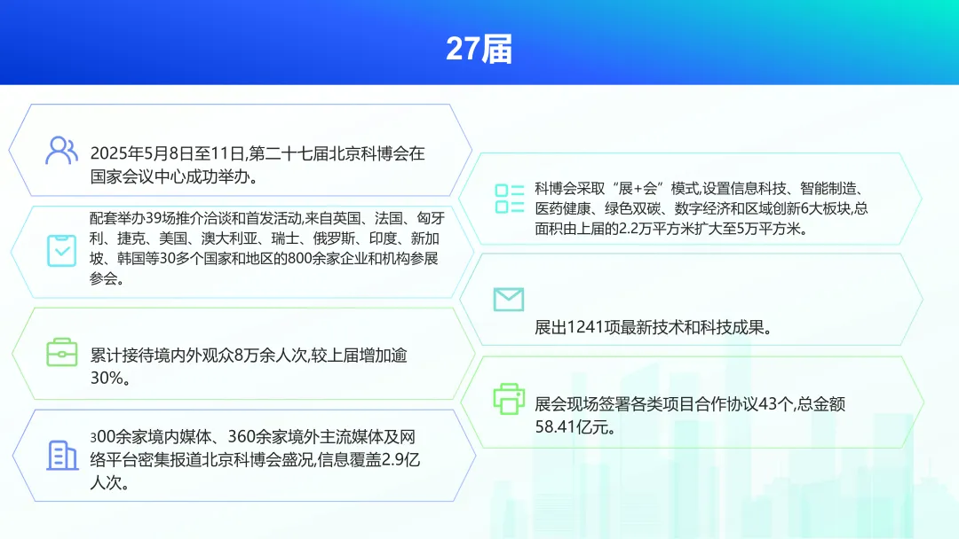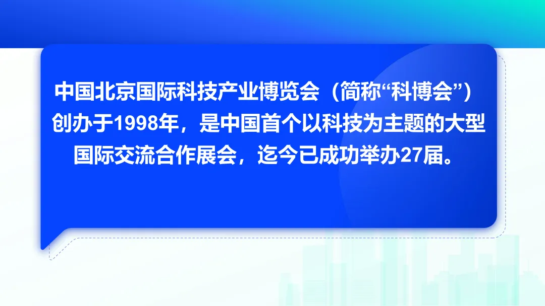 中国北京国际科技产业博览会(简称“科博会”)源于1998年由科技部、商务部、教育部、工业和信息化部、国务院国资委、中国贸促会、国家知识产权局和北京市政府联合主办的中国北京高新技术产业国际周,2002年正式命名为中国北京国际科技产业博览会,是中国首个以科技为主题的大型国际交流合作展会,迄今已成功举办27届,执行单位首都会展(集团)有限公司。