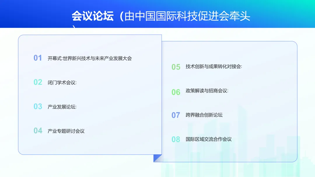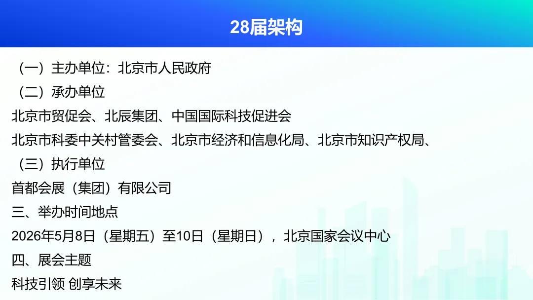 双方同意,在2026年5月召开的第28届中国北京国际科技产业博览会期间,由中国国际科技促进会负责协调统筹本届展会的论坛环节,包括开幕式大会、闭门学术会议、产业发展论坛、产业专题研讨会议、技术创新与成果转化对接会、政策解读与招商会议、跨界融合创新论坛、国际区域交流合作会议。