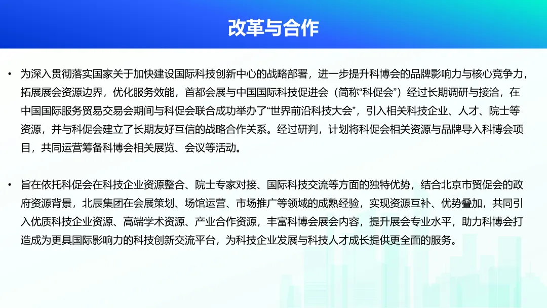 为深入贯彻落实国家关于加快建设国际科技创新中心的战略部署,进一步提升科博会的品牌影响力与核心竞争力,引入相关科技企业、人才、院士等资源,拓展展会资源边界,优化服务效能,首都会展与中国国际科技促进会(简称“科促会”)经过长期调研与接洽,建立了长期友好互信的战略合作关系。