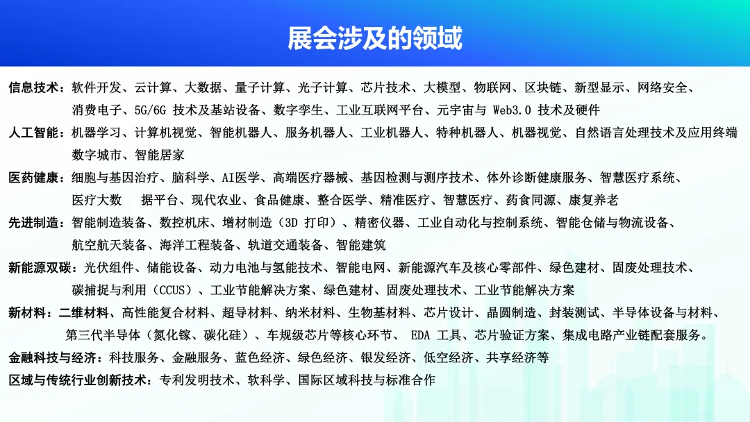 近年来,科博会已在光伏组件、储能设备、动力电池与氢能技术、智能电网、新能源汽车及核心零部件、绿色建材、固废处理技术、、绿色建材等新产业领域,二维材料、钙钛矿材料、纳米材料、晶圆制造、封装测试、半导体设备与材料等新材料领域,取得了重要成果,推动了相关领域的产业科技化、科技产业化。