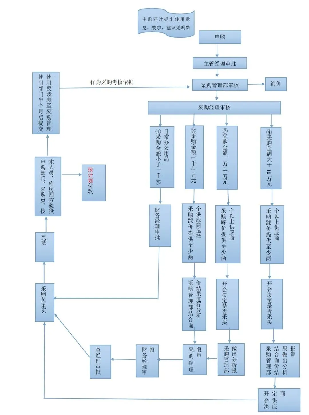 合规与廉洁:制定《采购廉政守则》,禁止宴请或回扣,设置举报渠道。 审批流程:采购申请需“需求部门+财务+领导”三级审批,招标时纪检监督。 权限分级:按金额划分审批层级,如2万元以下由财务审核,5万元以上需总经理审批。 合同管理:明确合同条款,如交货条件、纠纷处理,确保法律合规。