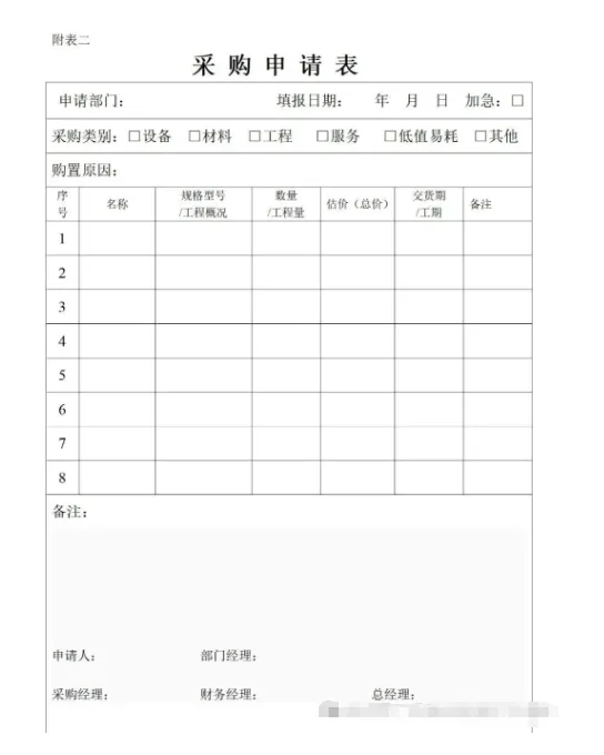 (3)其他材料设备及工程项目申购按照附表二(物资采购申请表.)的格式填写提报;