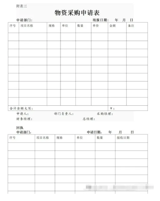 (4)日常物资采购按照附表三(物资采购审批单)的格式填写提报,请购部门提报的请购单在经过审批后主表交采购管理部保管,回执联交申请人保管做物资验收用,(涉及的请购数量过多时可以附件清单的形式进行提交)