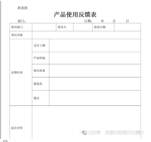 (6)使用部门在使用半个月后需对所用物资的采买及时性、采买质量按照附表四(使用反馈表)作出评价并提交至采购管理部