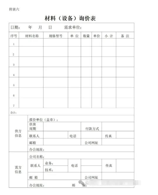 10.比价采购或招标采购应按照附表六(材料或设备询价表)的格式或拟定完整的招标文件格式进行询价;