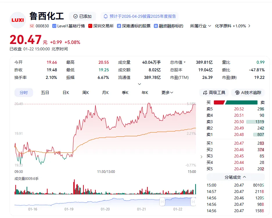 1 月 22 日,鲁西化工股价表现亮眼,最新股价报 20.46 元 / 股,涨幅达 5.03%,收盘价刷新近10年新高。