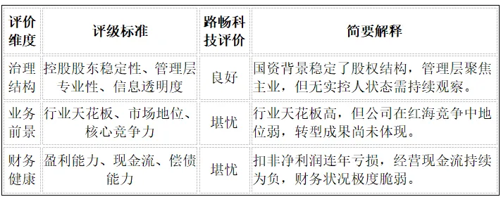 基于治理、业务与财务的综合判断,我们给予路畅科技“堪忧”的质地评级。