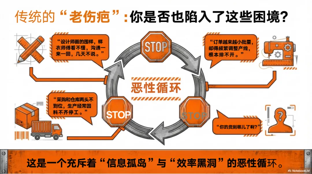 【你是否也遇到过这样的困境?】“设计师画的图样,样衣师傅看不懂,沟通一来一回,几天不说。”“订单越来越小批量,却得频繁调整产线,根本排不开。”“采购和仓库两头不到位,生产经常因料不齐停工。”这些问题,许多传统服装工厂都深有体会。