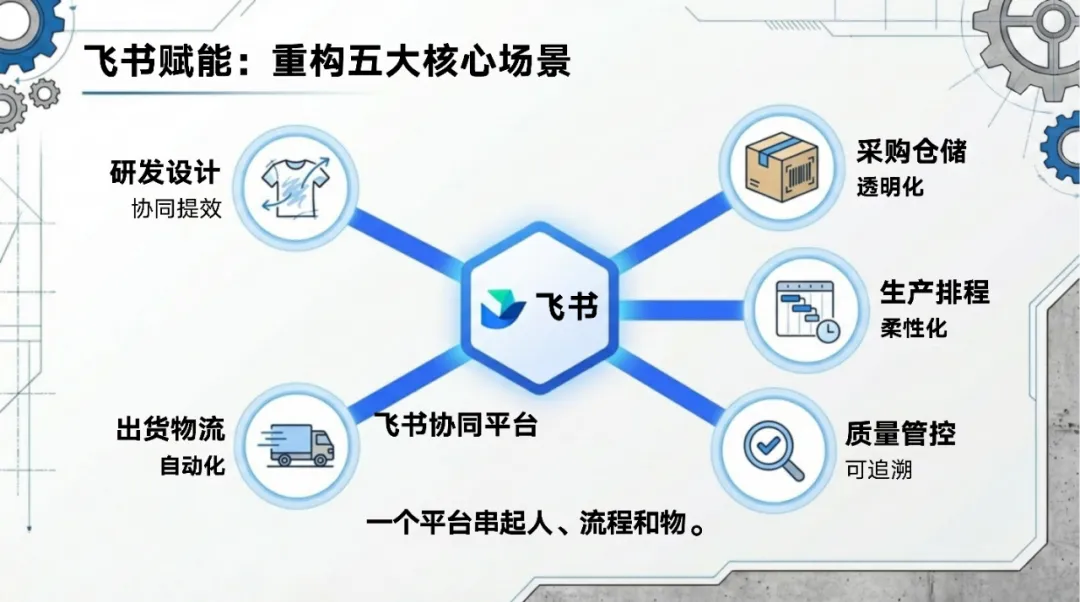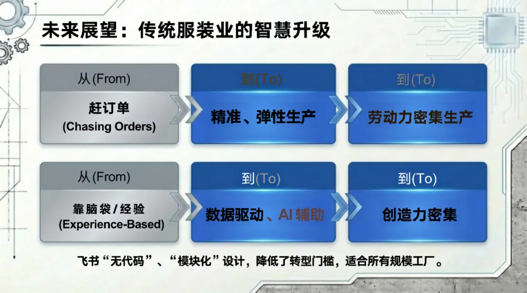 这才是服装产业的智慧未来。飞书生态通过“无代码”、“模块化”设计,降低了转型门槛,适合所有规模的服装工厂。