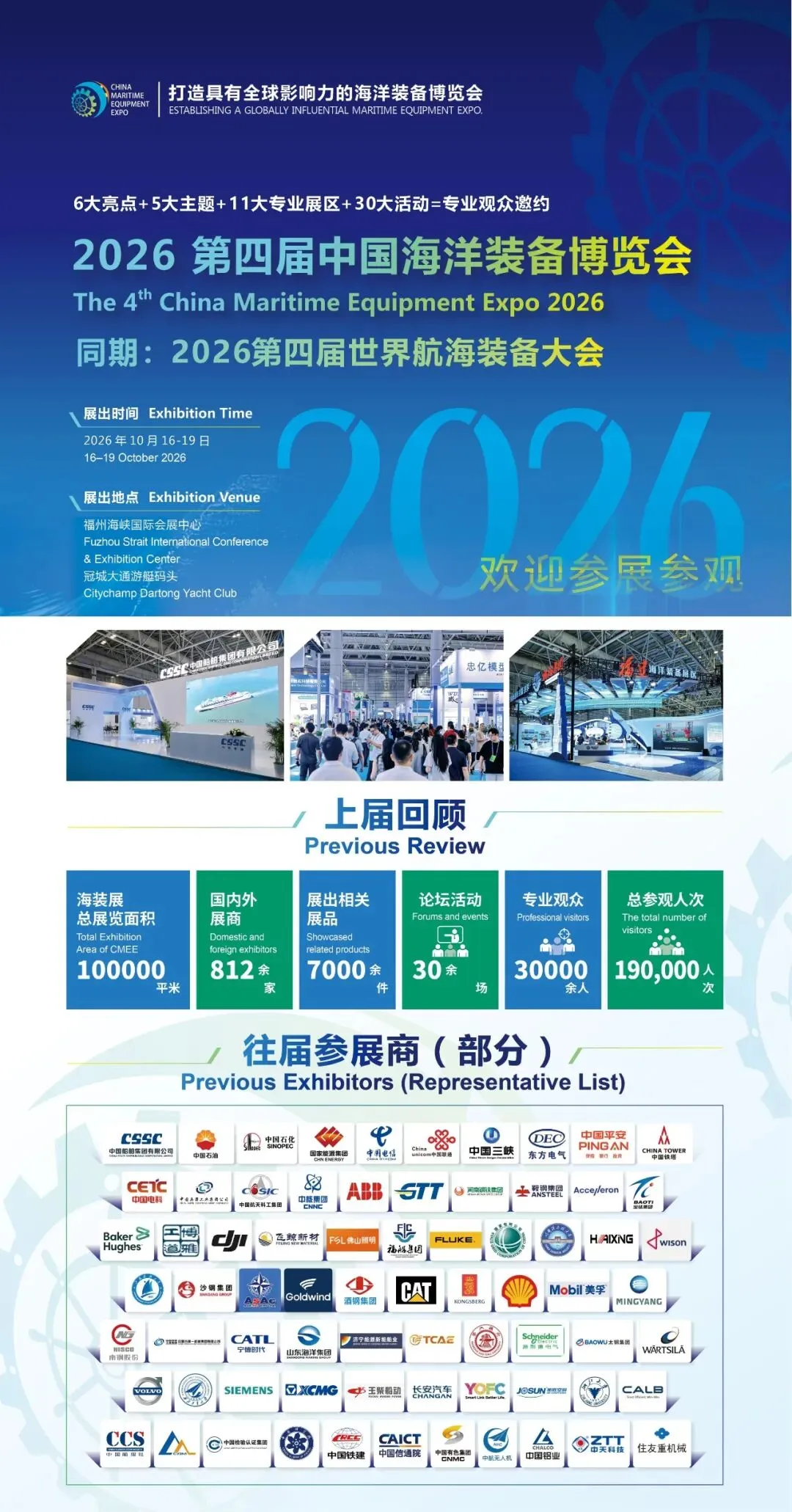 为深入贯彻党的二十大精神和习近平总书记关于经略海洋的重要指示,扎实推进海洋强国建设,加快培育海洋领域新质生产力,服务现代化海洋产业体系与产业集群高质量发展,在福建省人民政府的大力支持下,2026第四届中国海洋装备博览会将于2026年10月16-19日在福州举办。本届博览会恰逢“十四五”圆满收官与“十五五”开局的关键时期,旨在通过搭建专业化、国际化、高水平、深层次的交流合作平台,助推我国涉海领域新技术、新装备、新产业、新模式、新生态快速融合发展,促进海洋产业向高端化、智能化、绿色化、服务化转型升级,为“十五五”海洋经济的高质量发展注入澎湃动能。