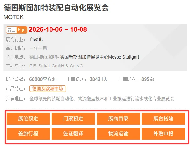德国斯图加特装配自动化展览会MOTEK【展位预定、门票预定、展商目录、展台搭建、差旅行程、签证、翻译、物流运输、补贴申报】