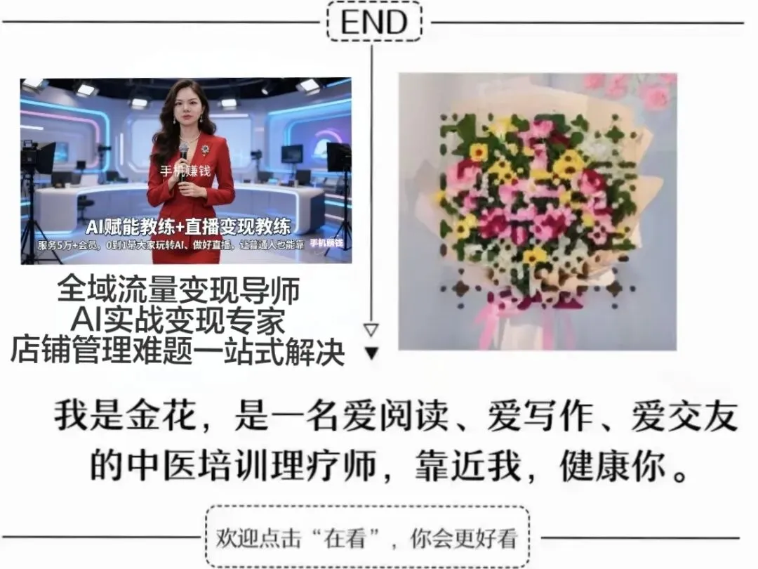 我是谢金花,常驻广州的江西萍乡人。我是全域流量变现导师、AI实战变现专家,还是养生门店管理难题一站式解决者、商超培训招商教练、AI赋能教练与直播变现教练、中医理疗培训教练。
