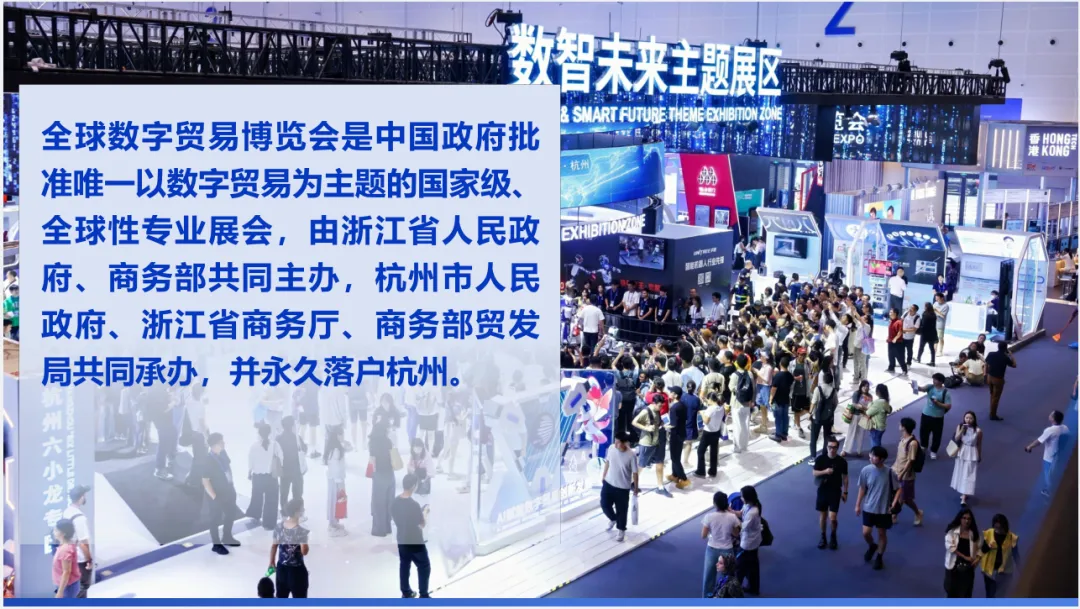 全球数字贸易博览会是中国政府批准唯一以数字贸易为主题的国家级、全球性专业展会,由浙江省人民政府、商务部共同主办,杭州市人民政府、浙江省商务厅、商务部贸发局共同承办,并永久落户杭州。