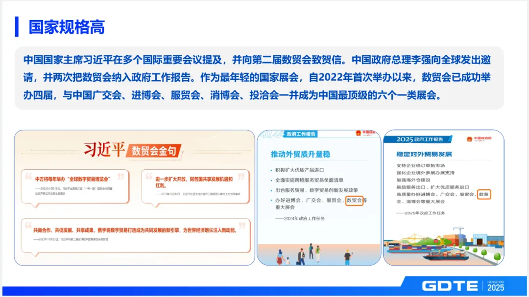 中国国家主席习近平在多个国际重要会议提及,并向第二届数贸会致贺信。中国政府总理李强向全球发出邀请,并两次把数贸会纳入政府工作报告。作为最年轻的国家展会,自2022年首次举办以来,数贸会已成功举办四届,与中国广交会、进博会、服贸会、消博会、投洽会一并成为中国最顶级的六个一类展会。