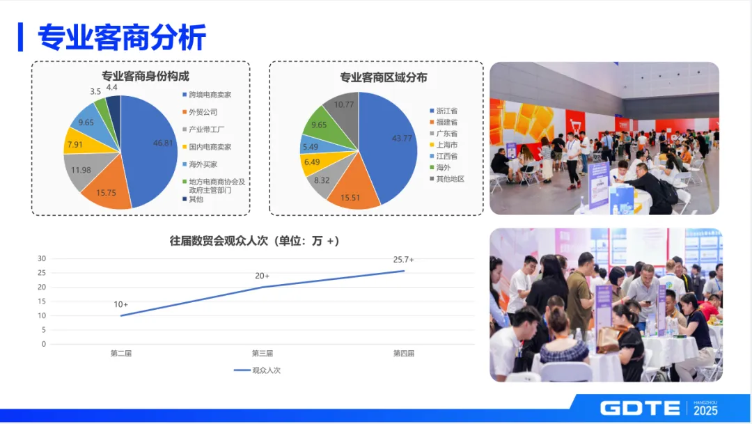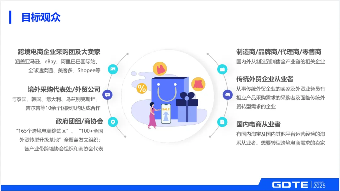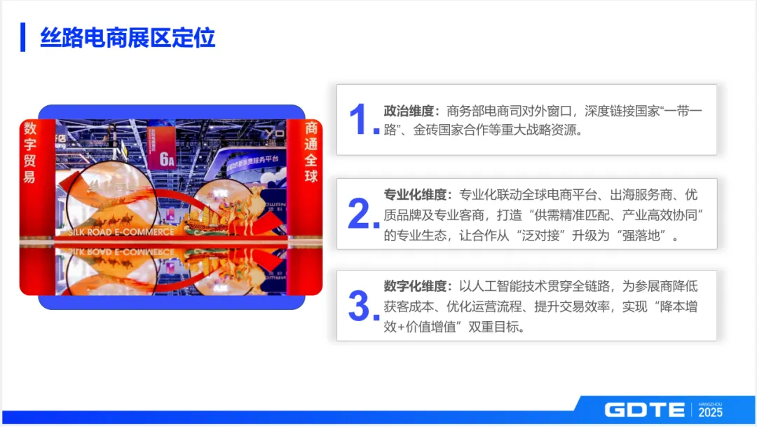 2.专业化维度:专业化联动全球电商平台、出海服务商、优质品牌及专业客商,打造“供需精准匹配、产业高效协同”的专业生态,让合作从“泛对接”升级为“强落地”。数字化维度:以人工智能技术贯穿全链路,为参展商降低获客成本、优化运营流程、提升交易效率,实现“降本增效+价值增值”双重目标。