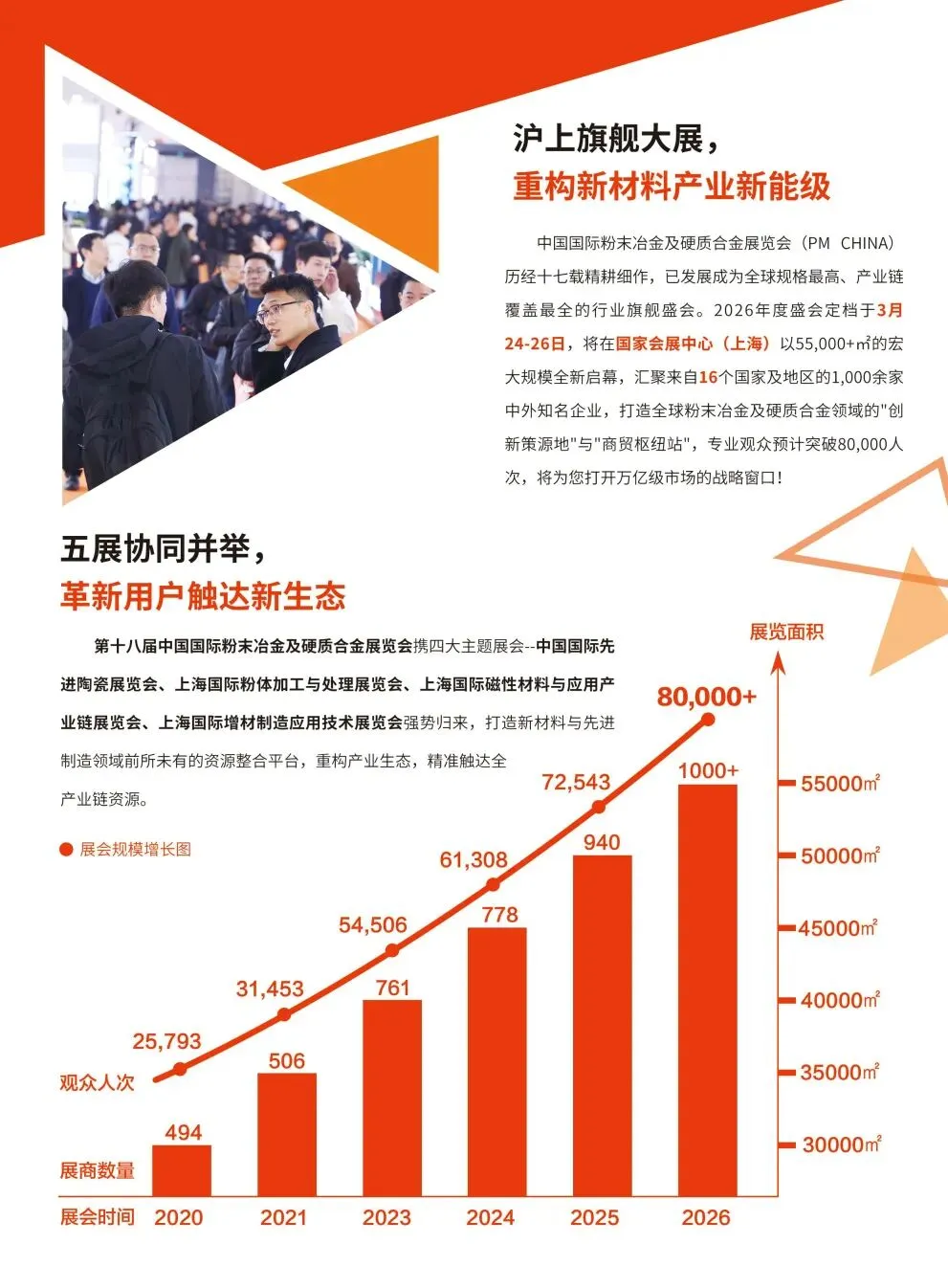 作为全球粉末冶金领域的旗舰盛会,2026第十八届中国国际粉末冶金及硬质合金展览会(PM CHINA)将于3月24-26日在国家会展中心(上海)盛大启幕!55,000+㎡超大展区、五展协同的资源整合平台,汇聚1,000+知名企业,80,000+人次专业观众重磅集结。