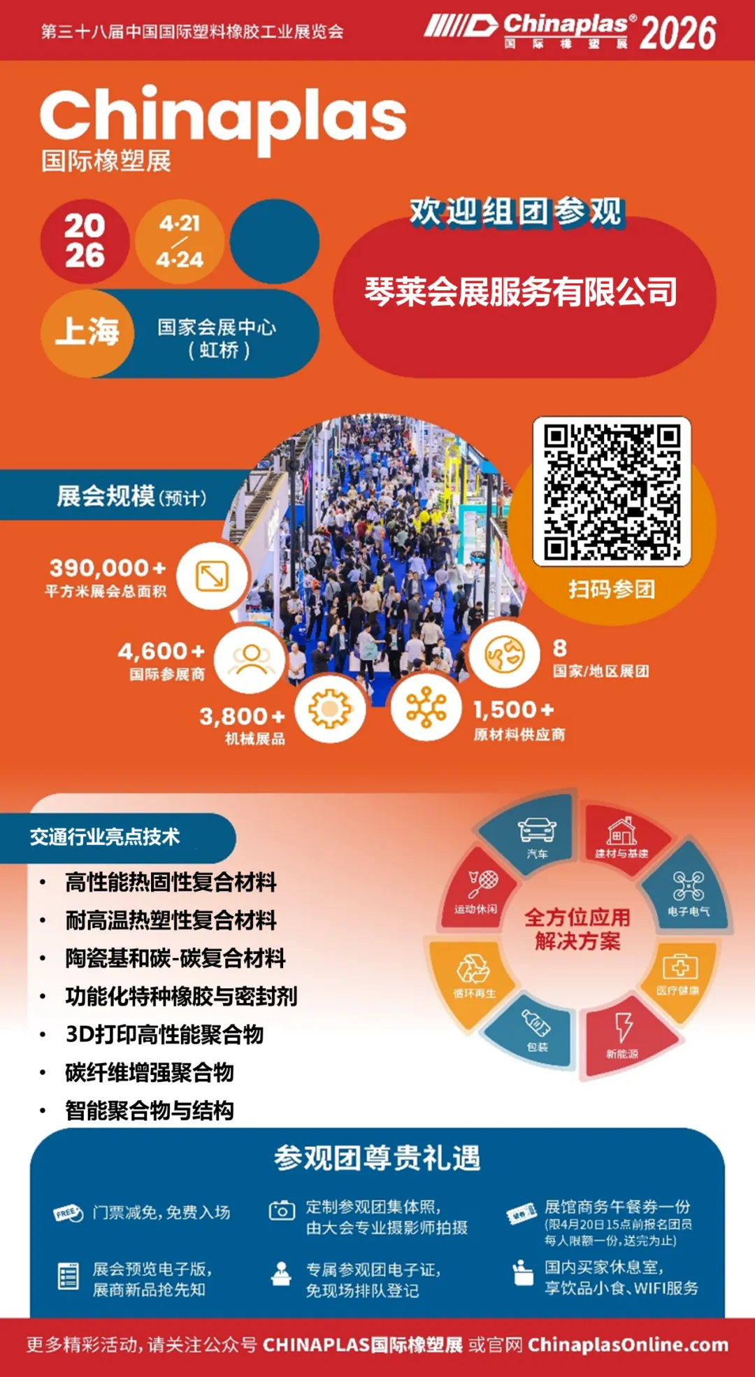 作为橡塑行业年度盛会,第三十八届中国国际塑料橡胶工业展览会(Chinaplas 2026) 将于 2026年4月21日至24日 在上海国家会展中心(虹桥)隆重举行。本届展会以“创新科技 · 绿色未来”为主题,汇聚全球行业精英,展示前沿材料、技术与设备,助力产业升级与合作。