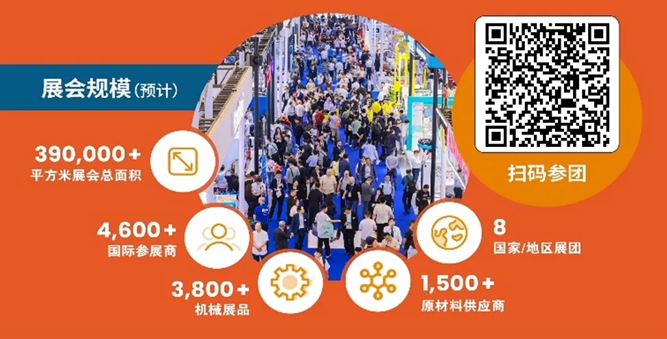 预计规模:✅ 展会总面积 390,000+ 平方米✅ 4,600+ 家国际参展商✅ 3,800+ 台机械展品✅ 8 个国家/地区展团✅ 1,500+ 家原材料供应商