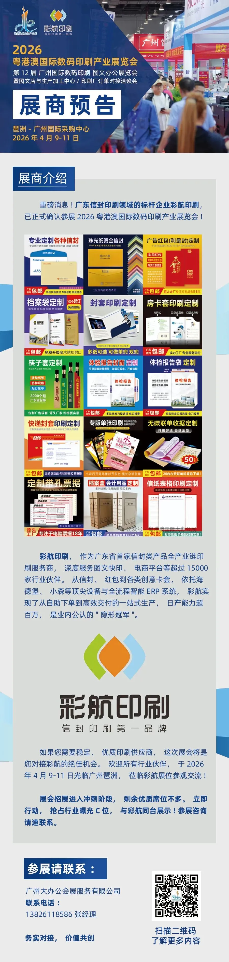 【展商播报】广东信封印刷领域的标杆企业——彩航印刷,已正式确认参展2026粤港澳国际数码印刷览会!