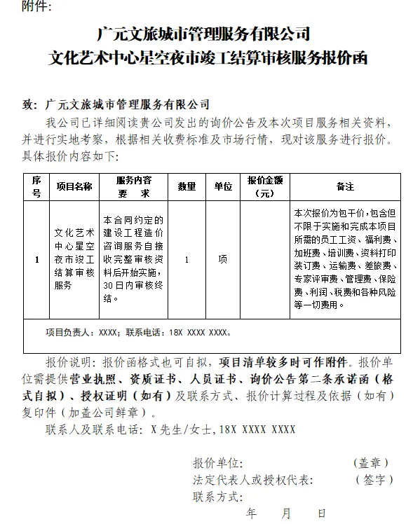 广元文旅城市管理服务有限公司(以下简称询价人),根据市文旅康养集团《关于印发<广元市文化旅游康养发展集团有限公司阳光采购管理办法>的通知》(广文旅康发〔2025〕59号)有关规定,拟对文化艺术中心星空夜市竣工结算审核服务进行采购。为控制成本,保障工作顺利进行,现拟进行市场询价,特邀请符合本次采购人要求的报价人参加本项目的报价。望贵公司在规定时间内按实际情况提供相应的报价,如果报价合理,且能给予最优惠折扣,我公司将优先考虑。