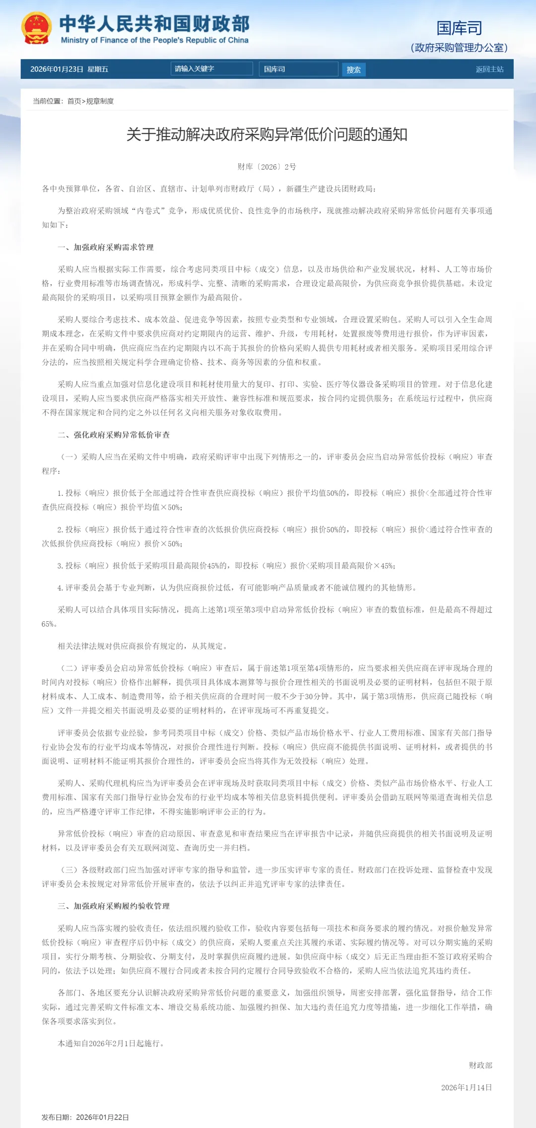 为整治政府采购领域“内卷式”竞争,形成优质优价、良性竞争的市场秩序,财政部1月22日对外发布通知称,推动解决政府采购异常低价问题,自2026年2月1日起施行。重点围绕需求管理、低价审查、履约验收三方面提出明确要求,旨在推动实现 “优质优价” 。