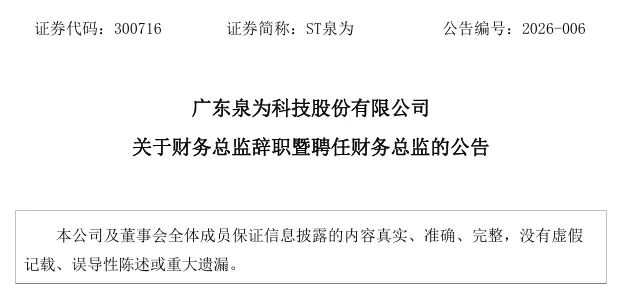 1月22日,ST泉为发布关于财务总监辞职暨聘任财务总监的公告。