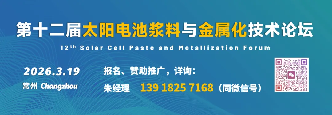 第十二届太阳电池浆料与金属化技术论坛将于2026年3月19日在江苏常州召开。会议将探讨光伏行业展望与浆料市场前景,异质结、TOPCon和XBC电池技术与金属化工艺,LECO激光设备与先进银浆,激光转印、全开口钢版、铜浆、银包铜、铝浆、铜电镀、无主栅技术与应用,光伏电池金属化导电机理与接触机制,晶硅-钙钛矿叠层电池金属化工艺与浆料技术展望等。