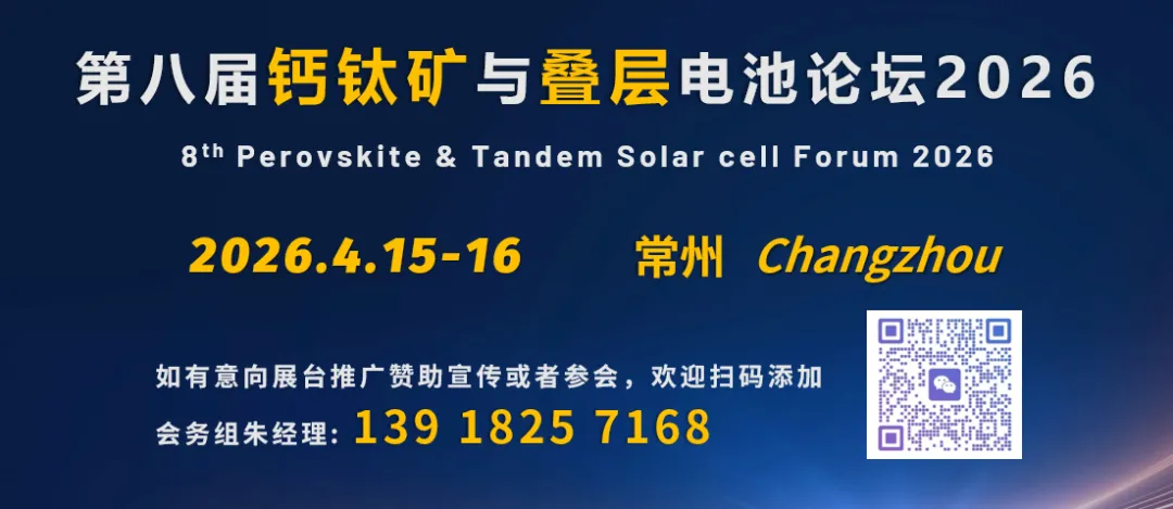 第八届钙钛矿与叠层电池论坛将于2026年4月15-16在常州召开。会议将探讨光伏行业展望与钙钛矿和叠层电池市场,大面积工业化钙钛矿电池材料体系、制造工艺与核心设备,钙钛矿与叠层电池良率和转换效率提升、成本降低与长期稳定性研究,两端、三端和四端叠层组件技术研发与结构设计,钙钛矿与叠层组件封装技术与封装材料,钙钛矿与叠层电池在BIPV、消费电子、可穿戴设备、新能源汽车、分布式电站和大型地面电站的应用方案等。