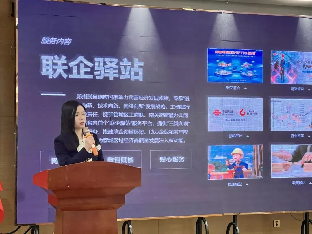 随后,联通管城分公司总经理张鸽详细阐述了“联企驿站”的服务体系与核心内容。她介绍,“联企驿站”旨在构建一个集“网络升级、数智赋能、综合服务”三位一体的赋能平台,其服务内容具体涵盖以下三类九项:
