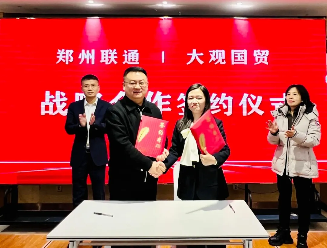 联通管城分公司总经理张鸽与大观国贸总经理马朝明代表双方签订战略合作协议