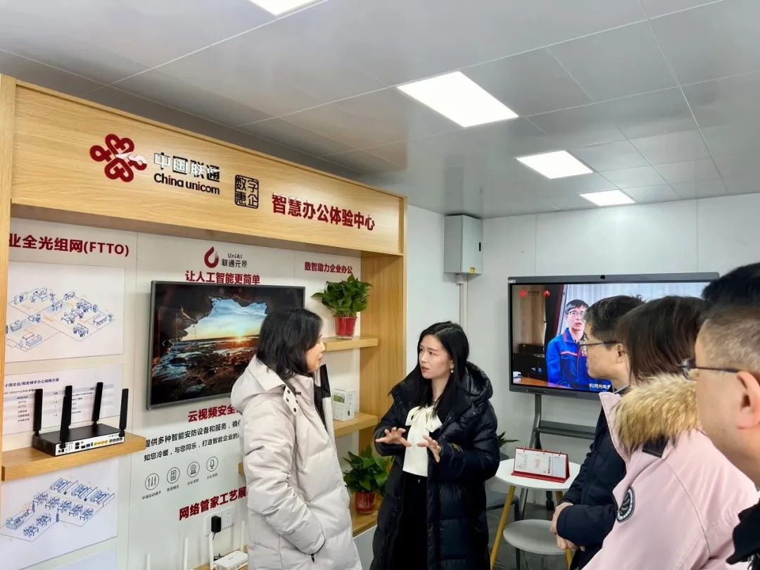 随后,众人移步至新揭牌的“联企驿站”进行参观。在联通管城分公司总经理张鸽的讲解与演示下,驿站内搭载的智能办公系统得到直观展示,让与会者切身感受到数字技术对提升商业运营效率的潜在价值。