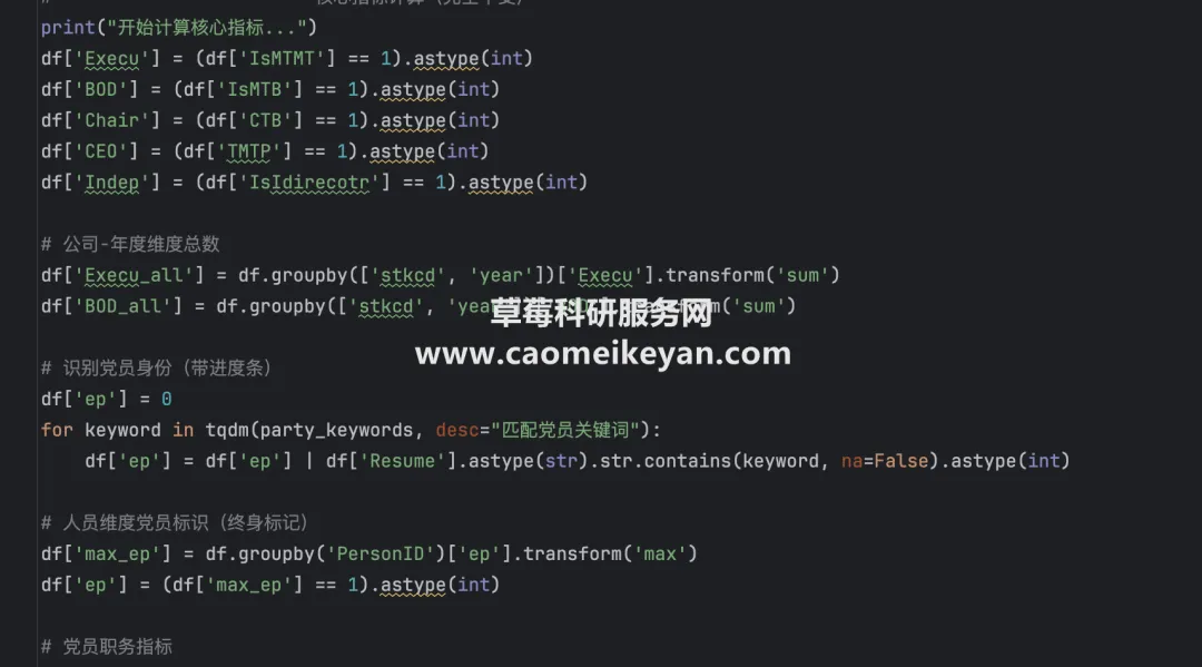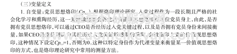2.测算方式:参考C刊《外国经济与管理》连燕玲老师的研究,根据烙印理论研究,入党过程作为一段长期且严格的社会化学习和熏陶经历,这一关键敏感期会将党的价值观思想烙印在每位党员身上,由此,是否拥有党员思想烙印,可以通过CEO是否经历过入党关键过程,以及是否拥有党员身份来间接衡量,如果CEO是党员则认为其经历过入党关键敏感期的熏陶,会被烙印上党的价值观思想烙印,这种情况下设定Cpi,t=1,否则为0。这种以特定身份作为代理变量来衡量某一价值观思想烙印的方式,也是烙印理论研究中常用的测量方法。