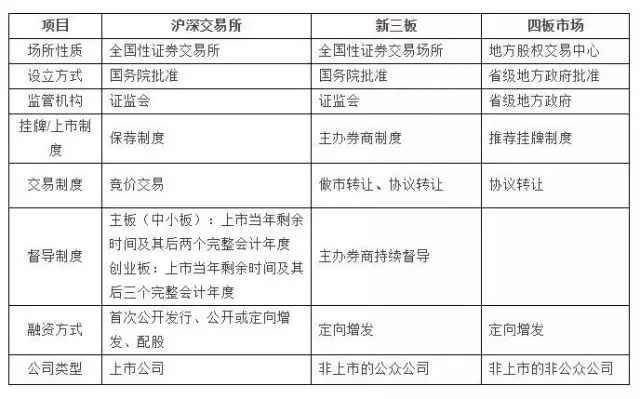 我国多层次资本市场目前主要由交易所市场(上海证券交易所、深圳证券交易所)、新三板(全国中小企业股份转让系统)、四板市场(区域股权交易中心)等构成,每个市场都各自扮演着其重要角色。现有的多层次资本市场已经能够基本满足不同类型的企业在不同发展阶段的融资需求。沪深交易所作为场内交易市场,与新三板市场和四板市场具有显著区别,其主要区别如下: