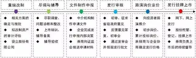 一般情况下,企业自筹划改制到完成发行上市总体上需要3年左右,主要包含重组改制、尽职调查与辅导、申请文件的制作与申报、发行审核、路演询价与定价及发行与挂牌上市等阶段。具体上市流程图如下: