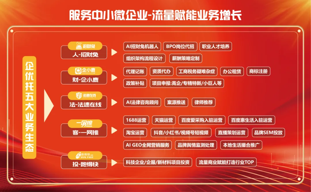 始终聚焦 “互联网 + 产业数字化” 赛道,企优托集团为企业全生命周期发展深度赋能。从公司初创的 0 到 1 孵化,到品牌建立、运营推广、发展提速各环节,以一站式全链路配套服务,陪跑企业突破成长周期,助力实现发展加速度,成为推动产业数字化转型的重要同行者 。