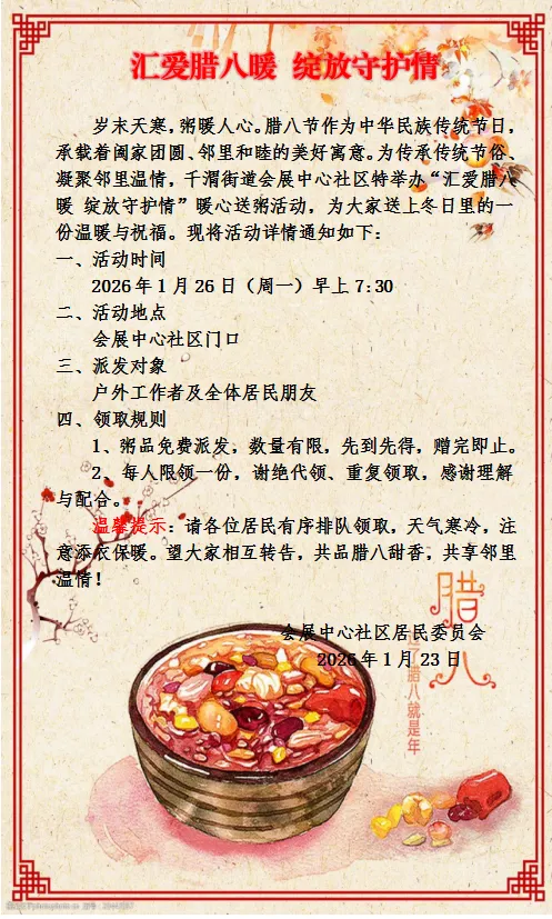 【腊八节】会展中心社区“汇爱腊八暖 绽放守护情”暖心送粥活动通知