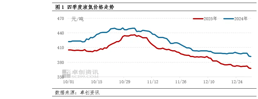 【导语】四季度供需端对液氮市场的支撑表现为先强后弱,液氮价格涨后回落。卓创资讯数据监测,四季度全国液氮均价至402元/吨,环比跌11%,同比跌5%。后市来看,2026年一季度液氮市场或将先抑后扬,元宵节前市场供需两弱,价格下跌为主,节后逐步反弹。