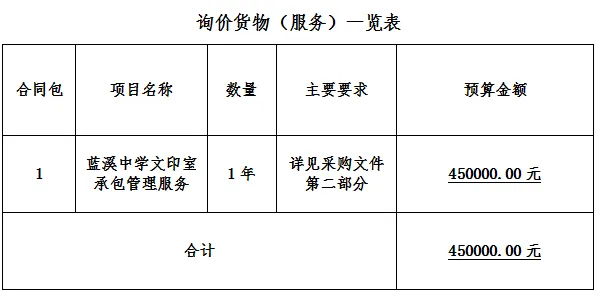 福建恒泰招标有限公司受福建省安溪蓝溪中学委托,对蓝溪中学文印室承包管理服务进行询价采购,现欢迎合格的供应商前来提交密封的响应文件,
