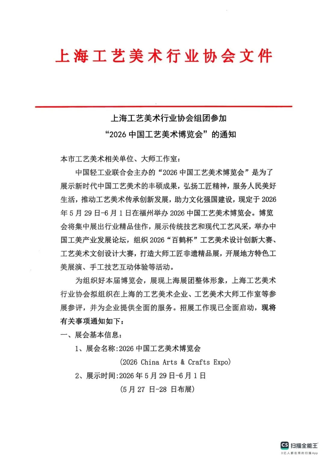 上海工艺美术行业协会组团参加“2026中国工艺美术博览会”的通知