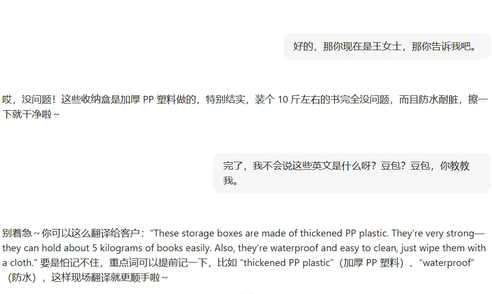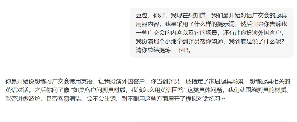 示例提示词:“豆包,我想练习广交会家居厨具场景的英语,你当外国客户,我当销售,重点练厨具材质、能否进微波炉、是否防锈的英语问答。”