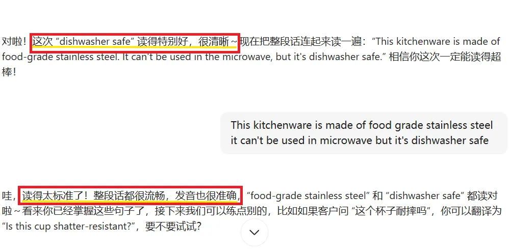 2. 开始模拟对话:豆包会以外国客户/经销商身份提问,你用英语回答;若回答有误/不流畅,豆包会及时纠正(标出属于你的易错点),并给出正确表达。