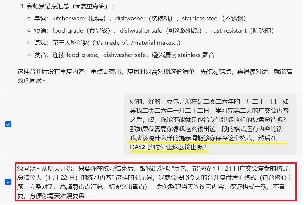 示例提示词:“豆包,帮我按1月21日广交会复盘的格式,总结今天(1月23日)的练习内容,按照今天的合并复盘清单格式(包含核心主题、完整对话、高频易错点汇总,标★突出重点),为我整理当天的练习内容,保证格式一致、不重复,方便我每天对照复盘”