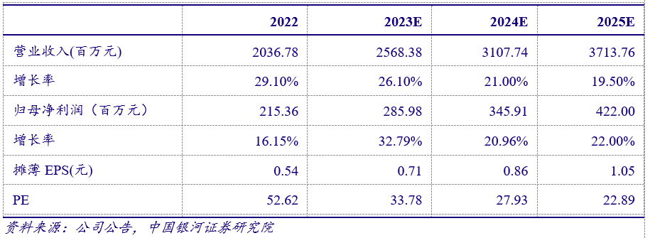 结合公司年报,我们引入2025年盈利预测。预计2023~2025年归母净利润为2.86/3.46/34.22亿元,同比+32.8%/21.0%/22.0%,EPS为0.71/0.86/1.05元,对应PE为34/28/23X,长期看好公司B+C端共振驱动业绩持续增长,但考虑到估值水平,维持“谨慎推荐”评级。