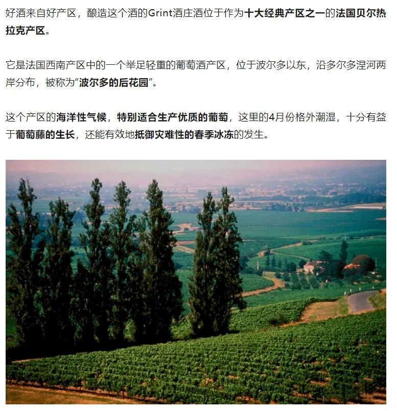 酒庄就在十大经典产区之一贝尔热拉克产区!用产自这里的美乐葡萄、赤霞珠葡萄和品丽珠葡萄三种葡萄混酿,还是30年的老藤,酿出有着浓郁果味、口感平衡圆润有层次的红酒,余味悠长~品质非常优秀